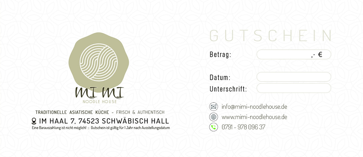 Verschenke Genuss und Freude mit einem Gutschein aus unserem MiMi Noodlehouse – individuell und ganz nach deinem Wunsch!